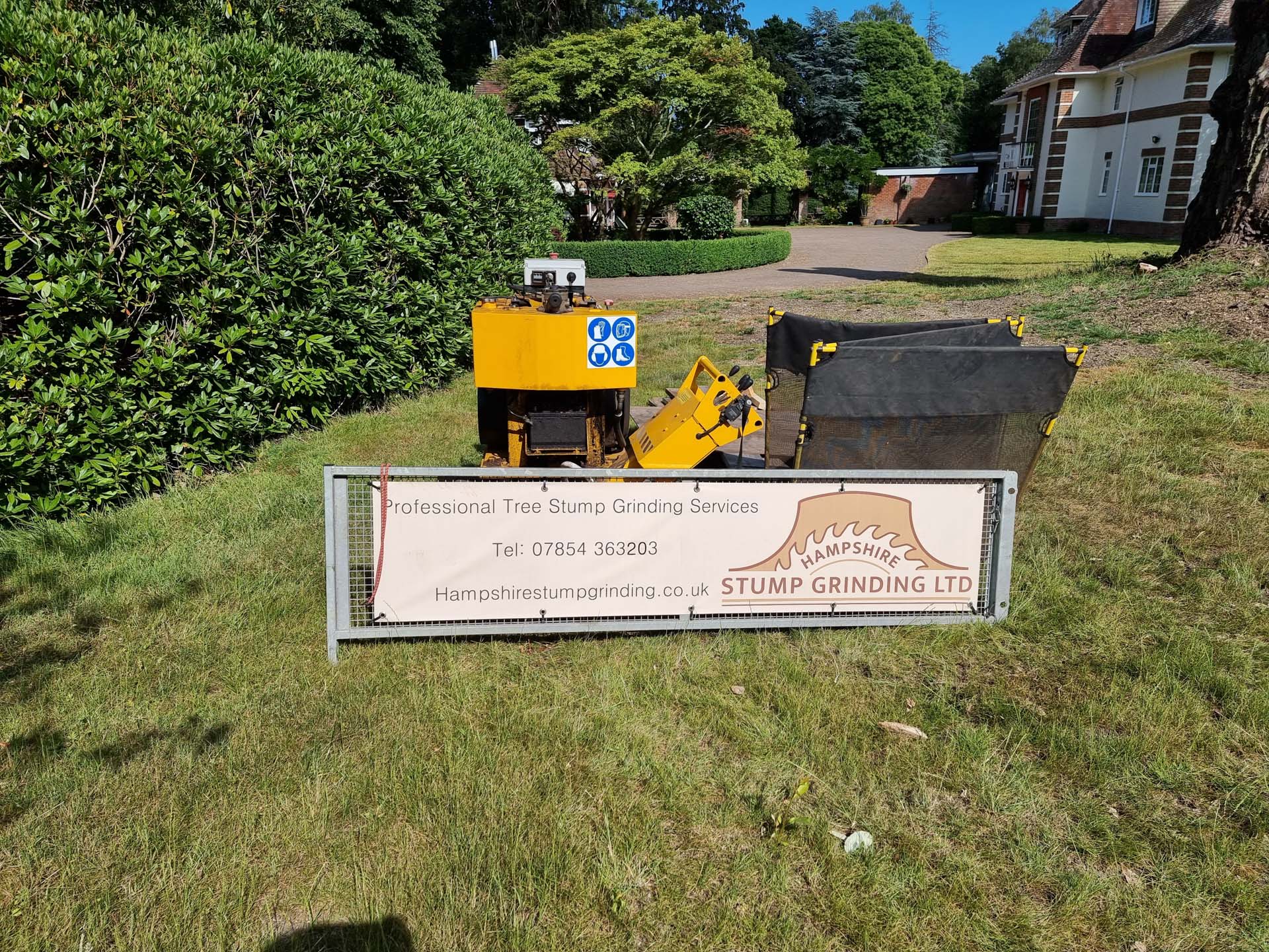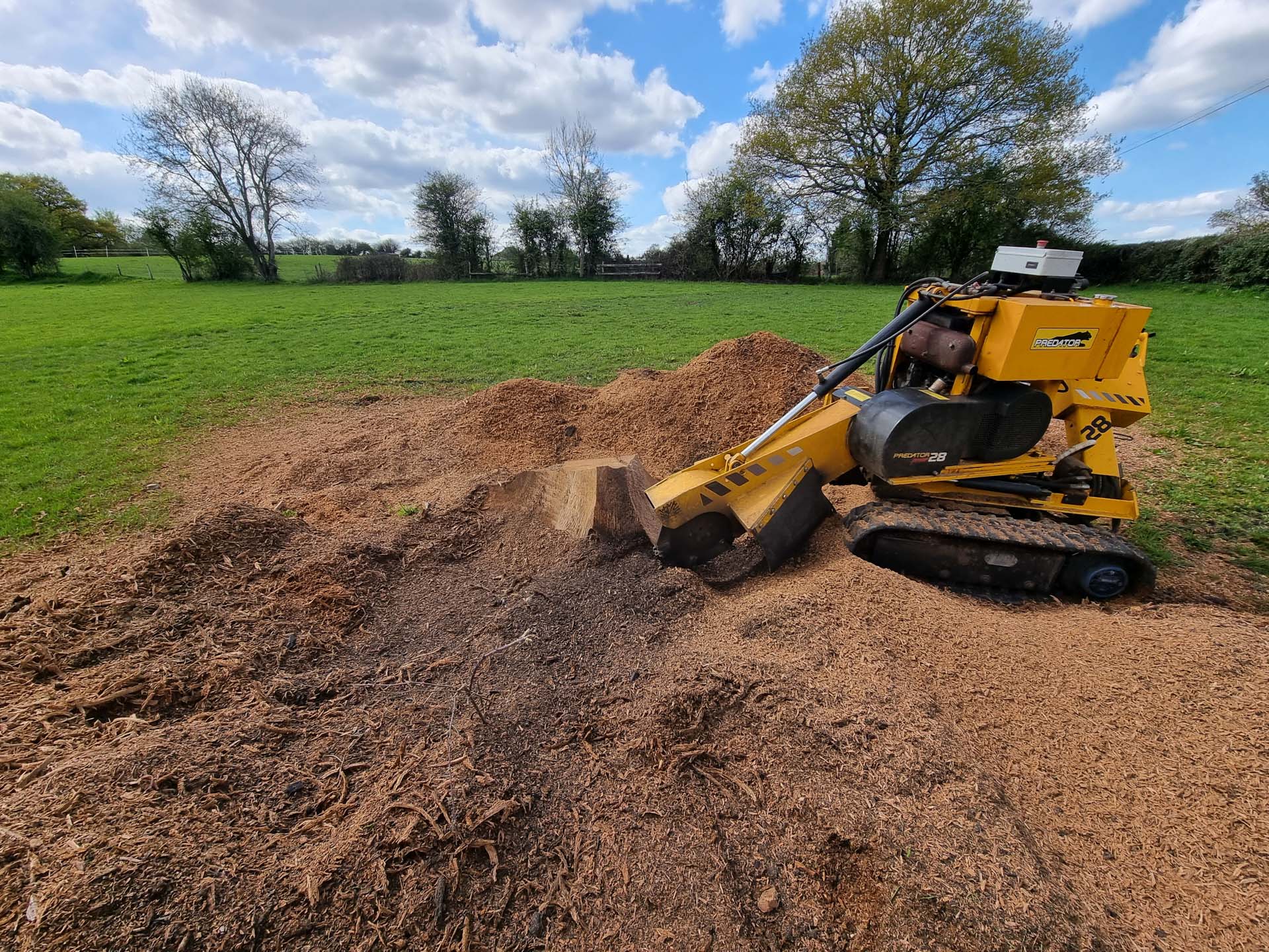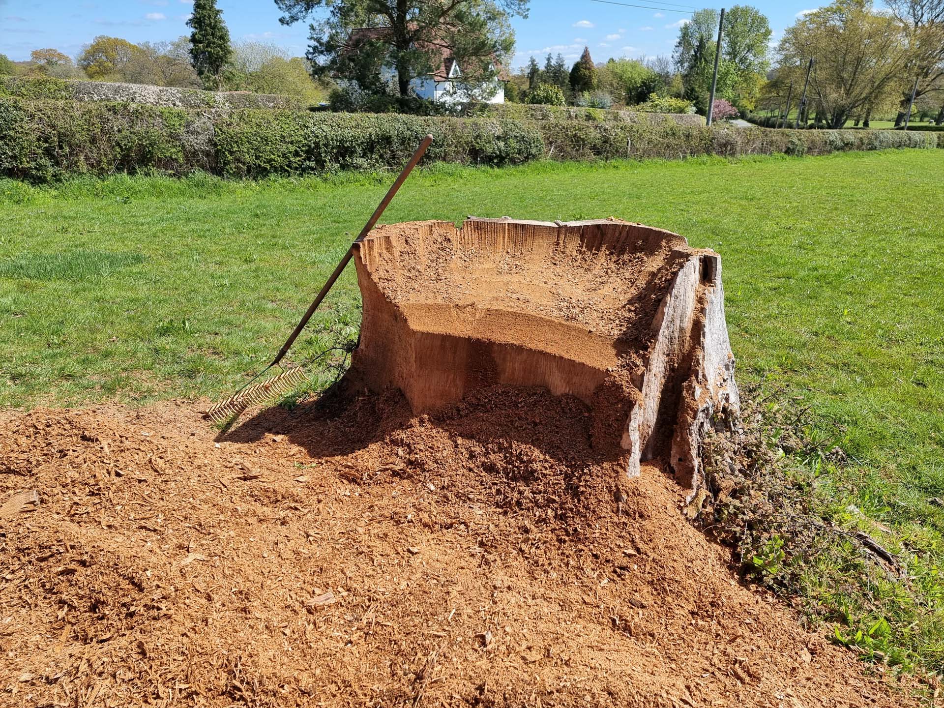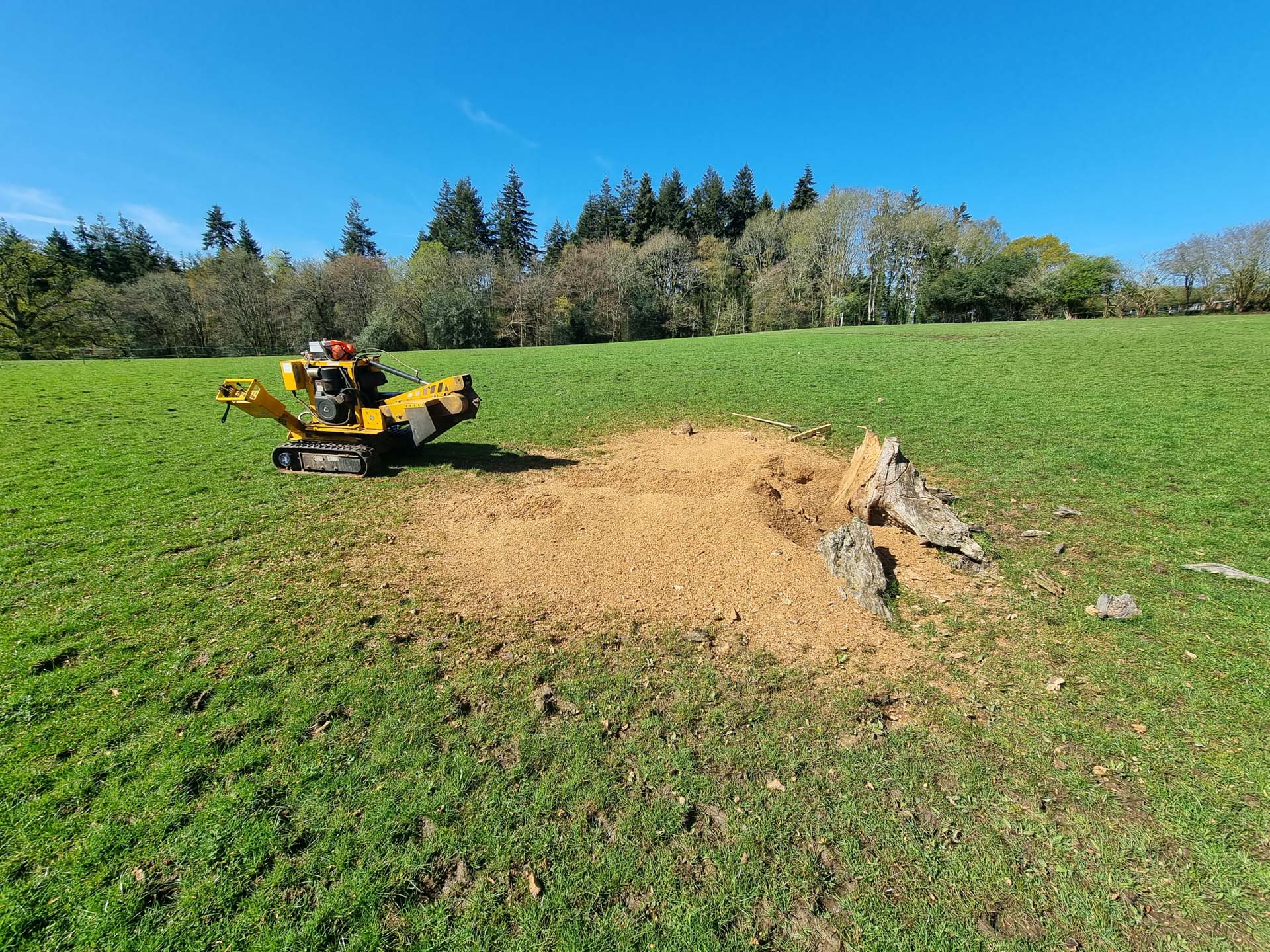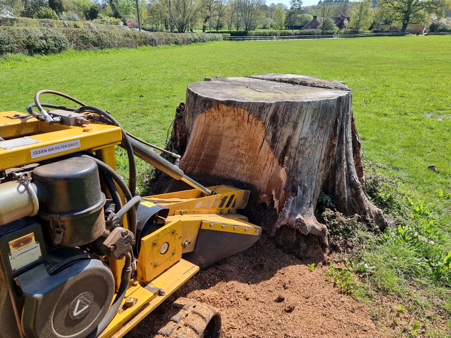 Hampshire Stump Grinding with a large tree stump and a field with blue sky.