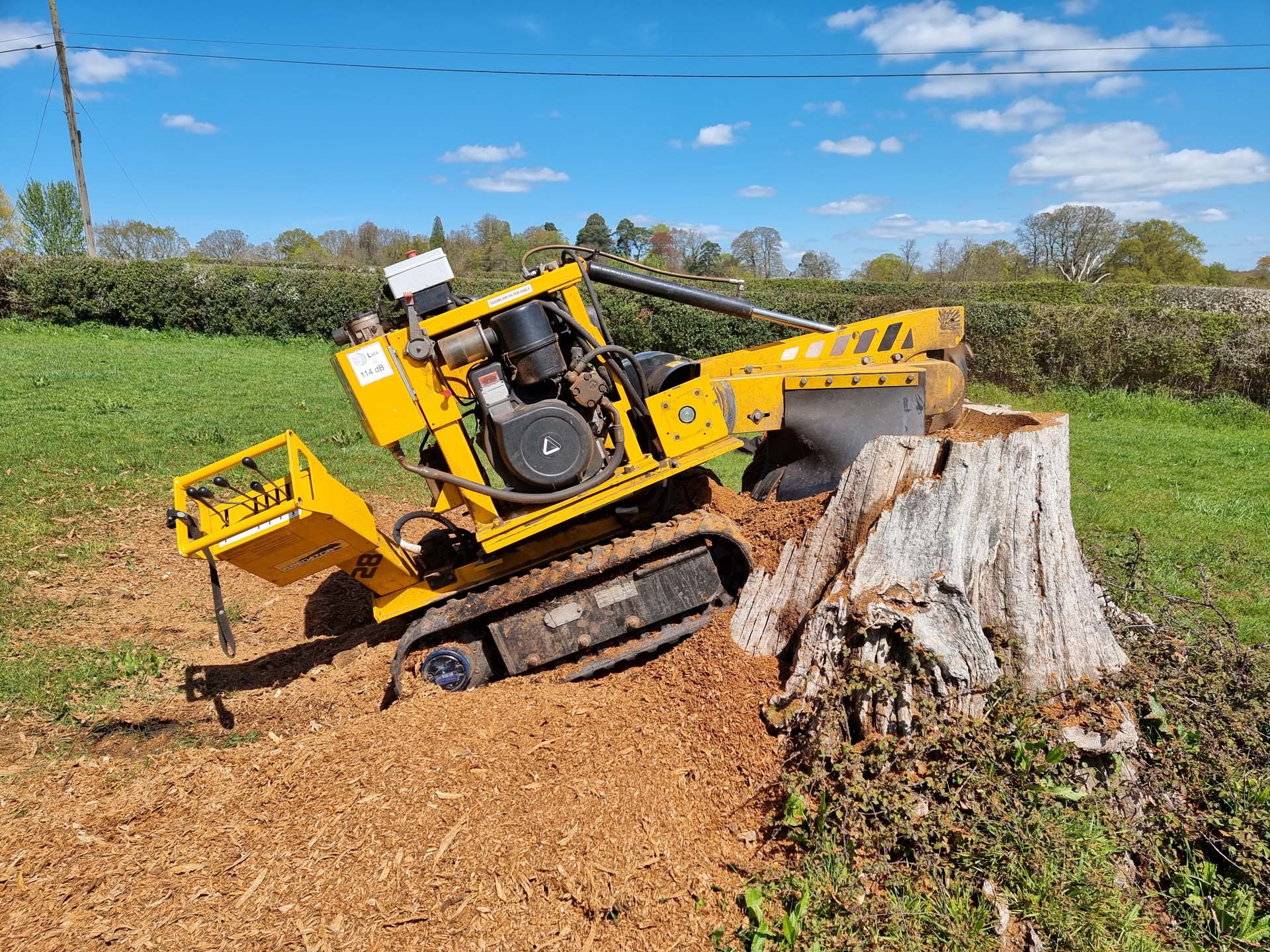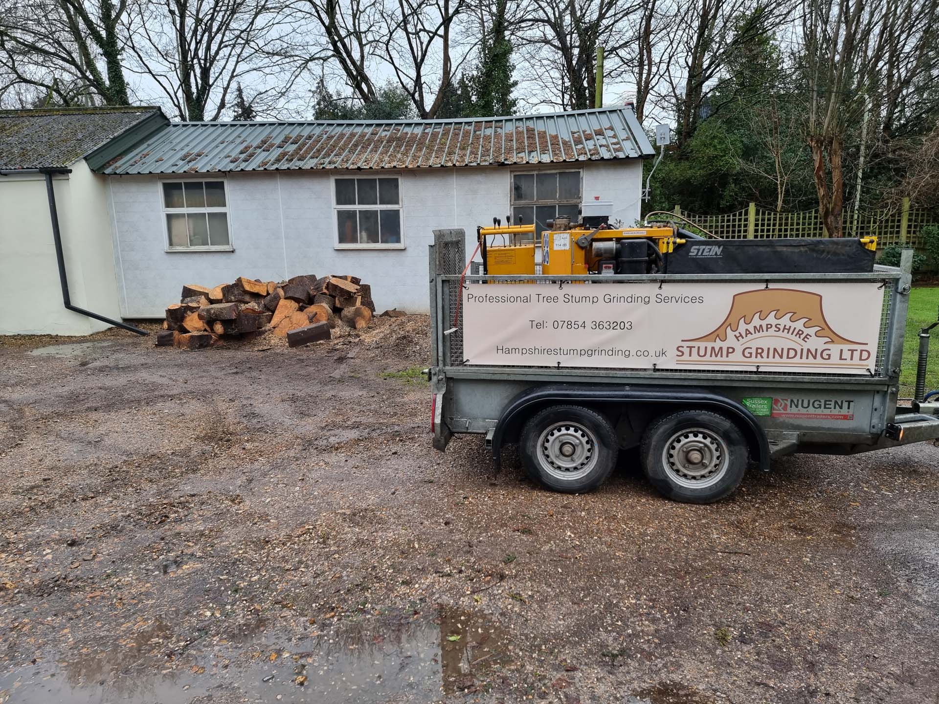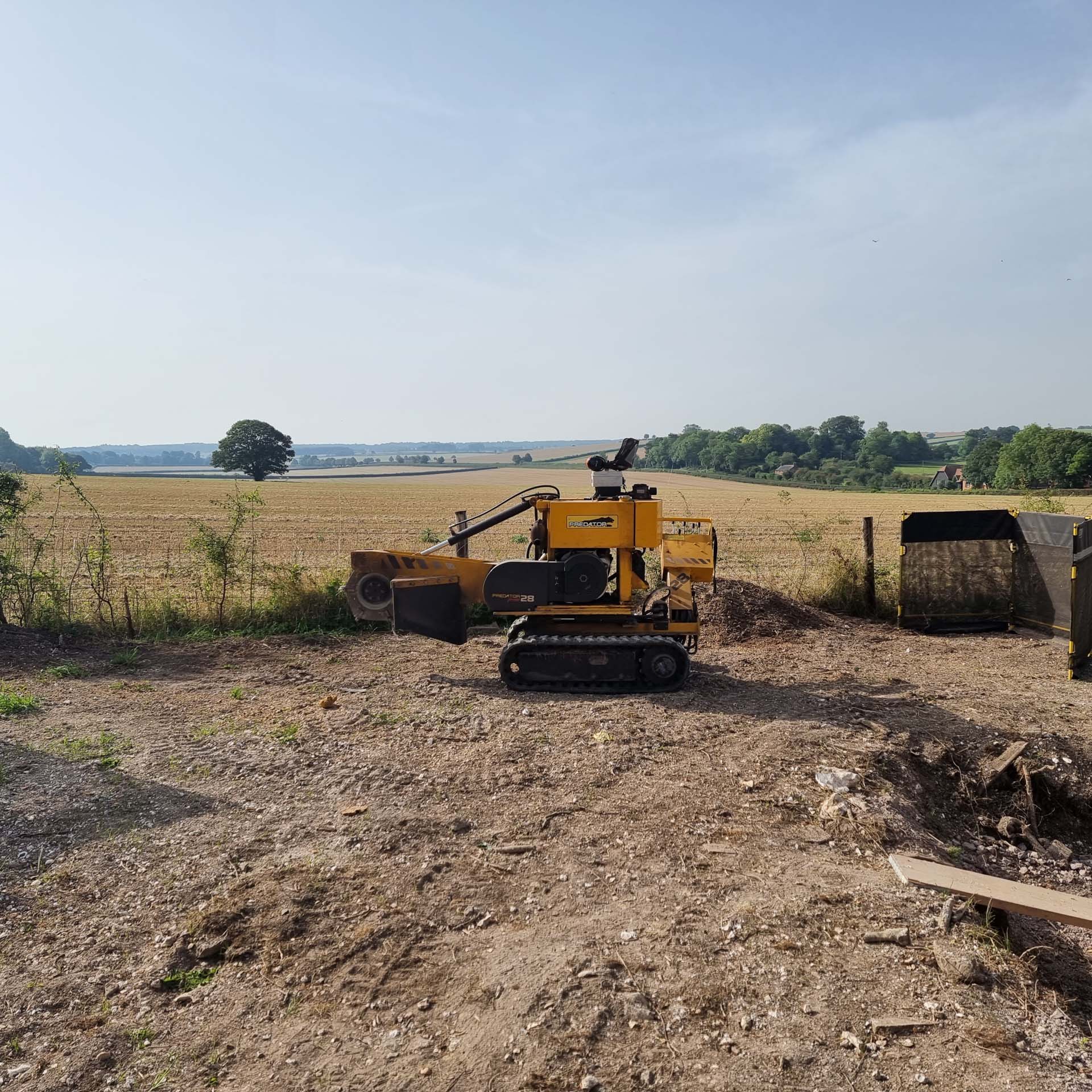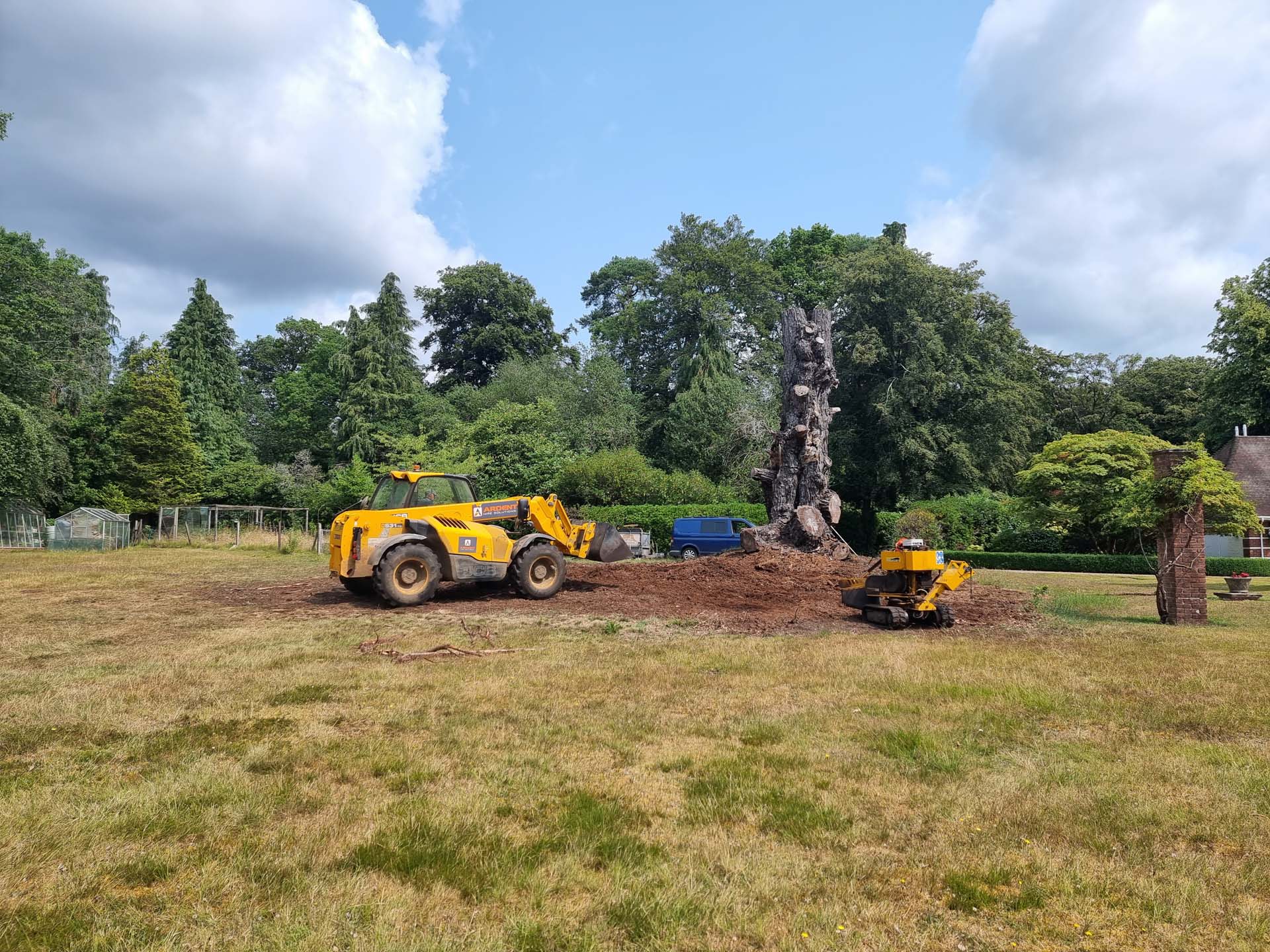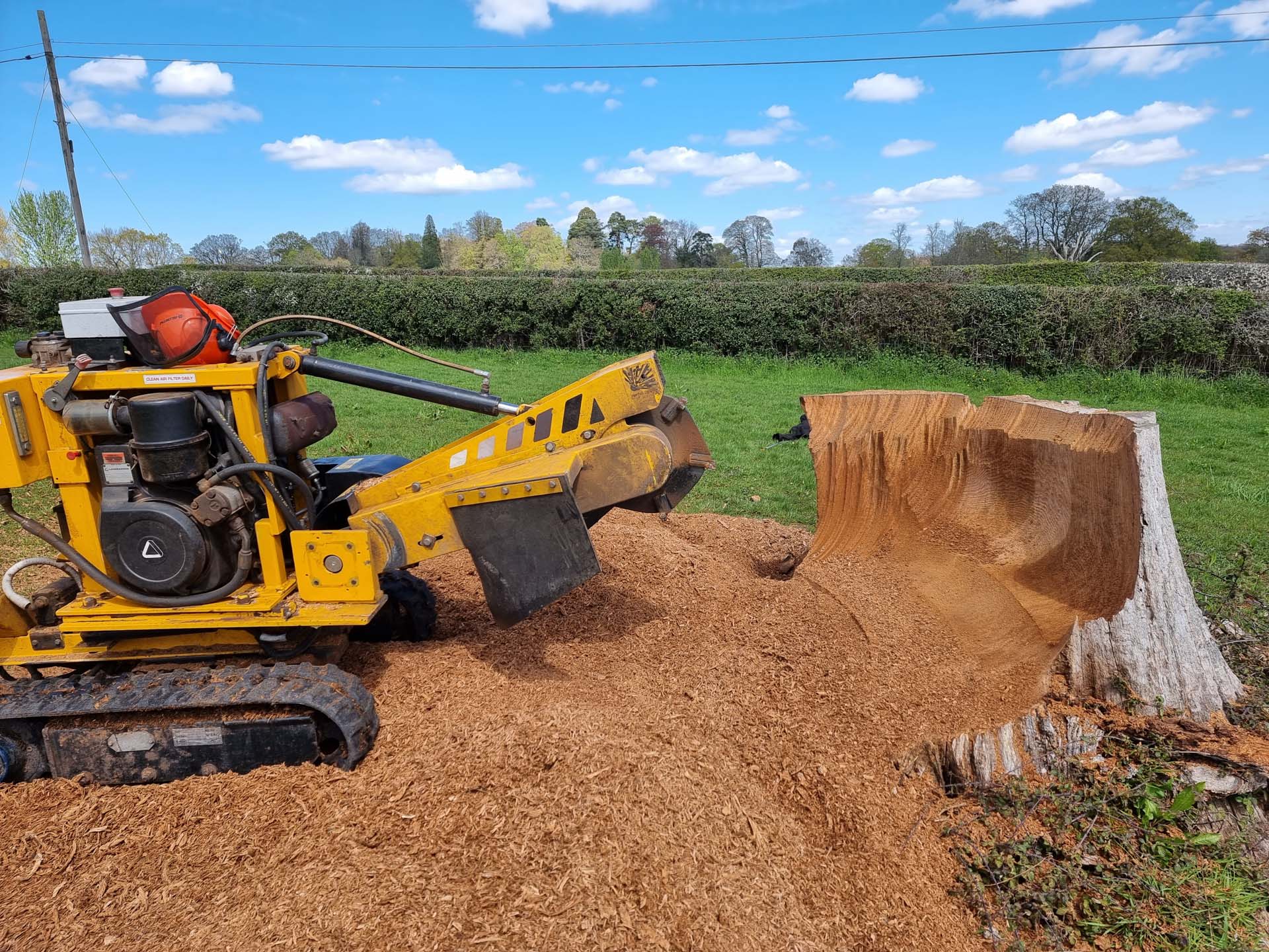 Hampshire Stump Grinding with a large tree stump and a field with blue sky.