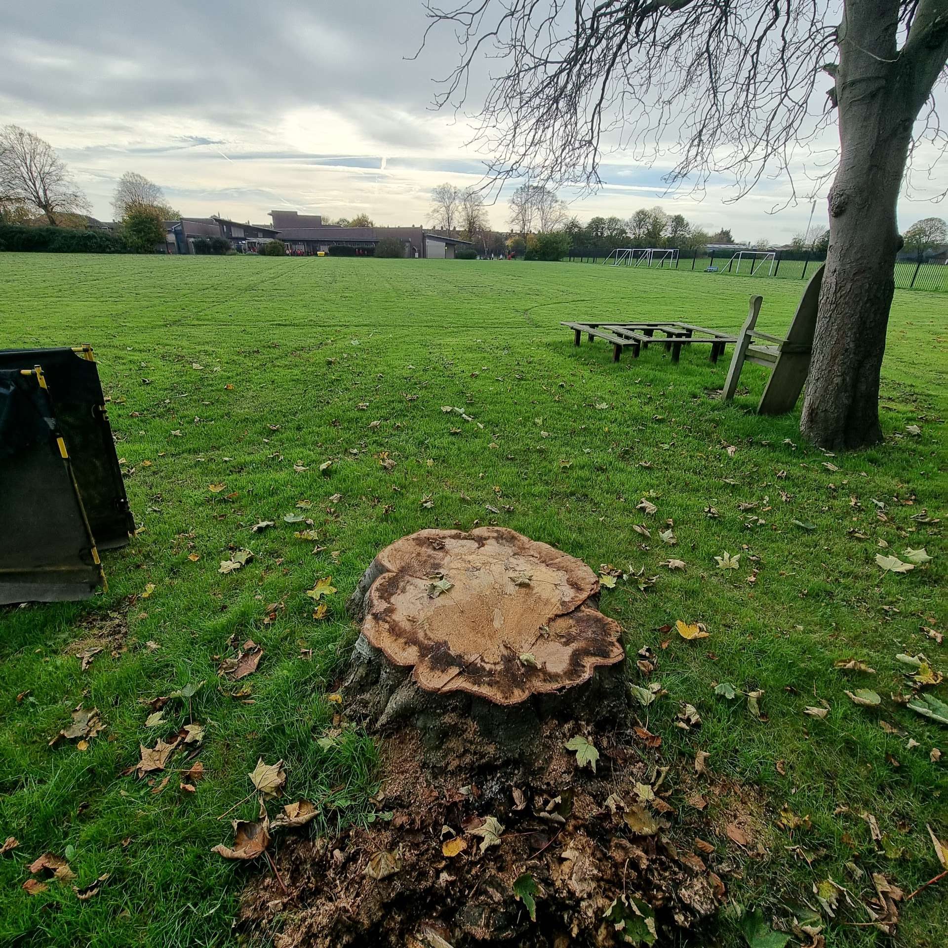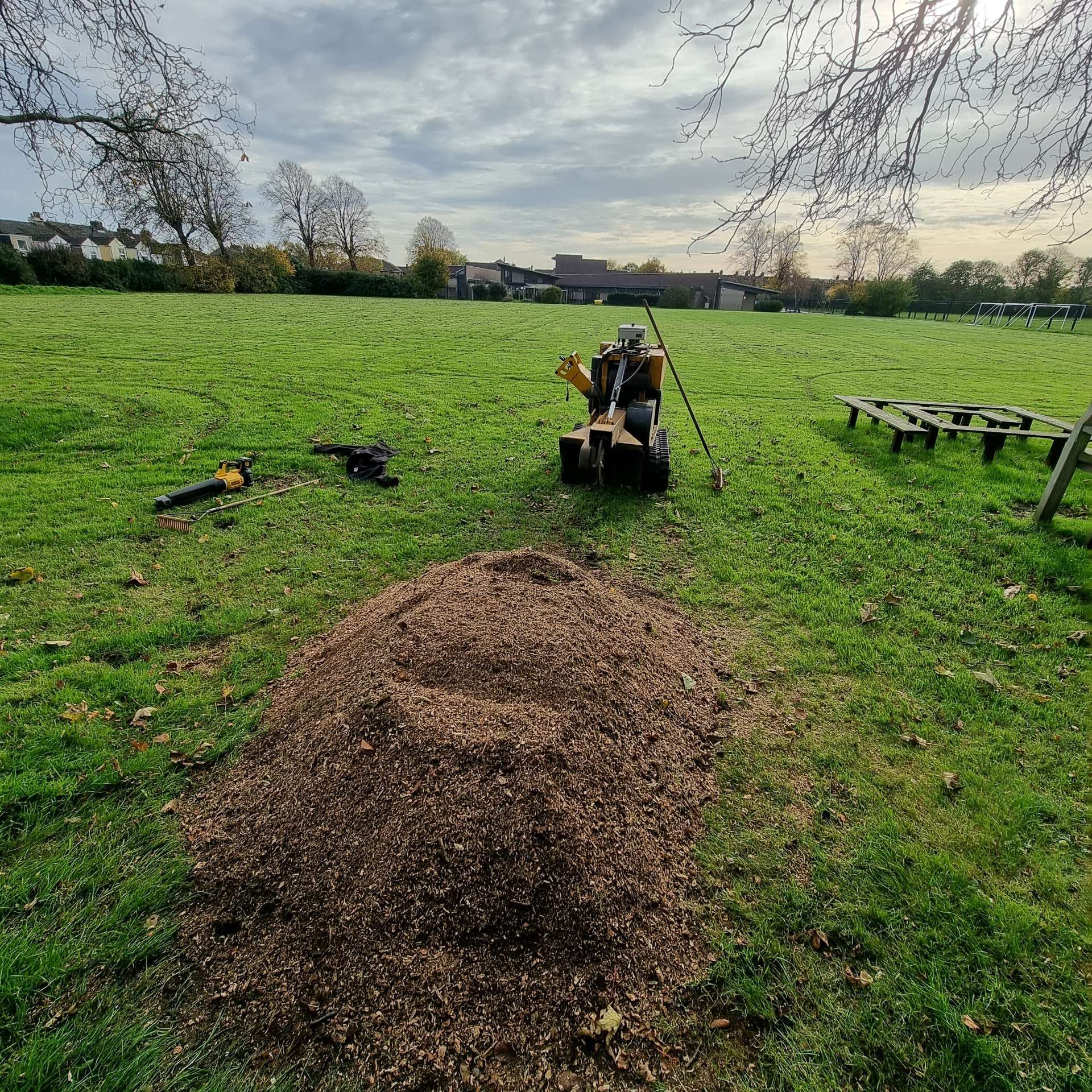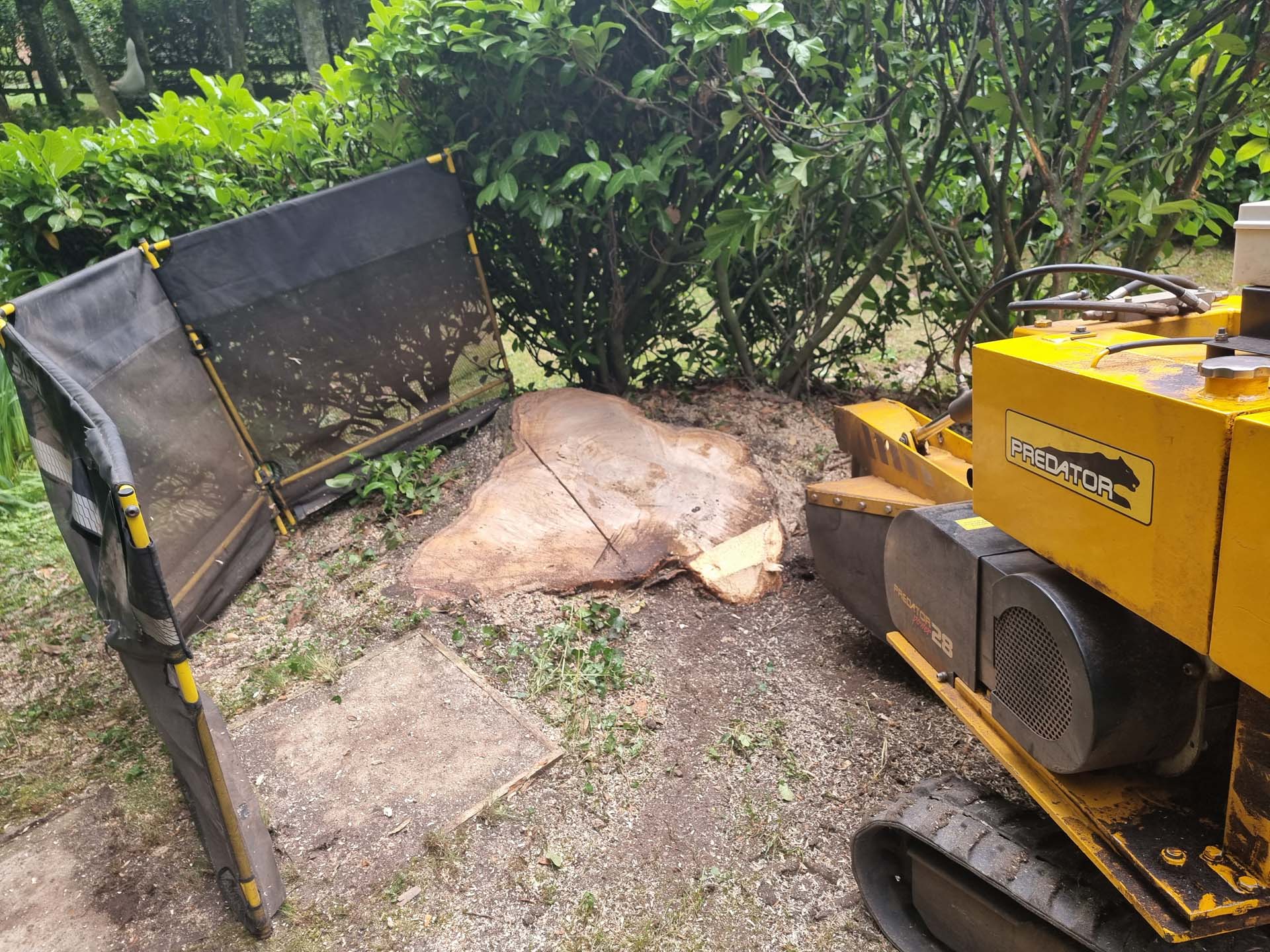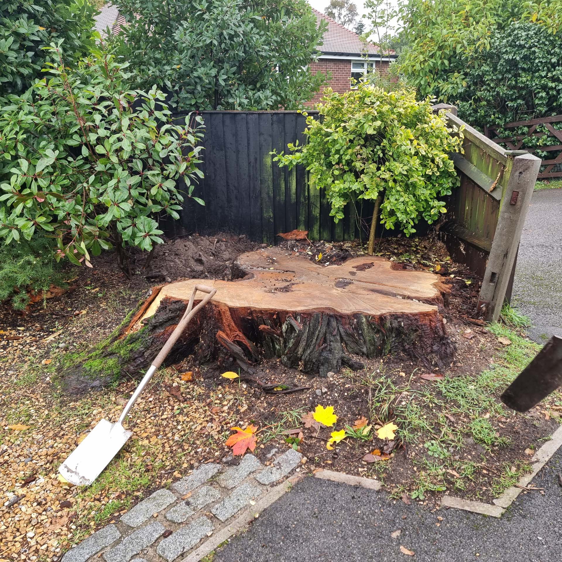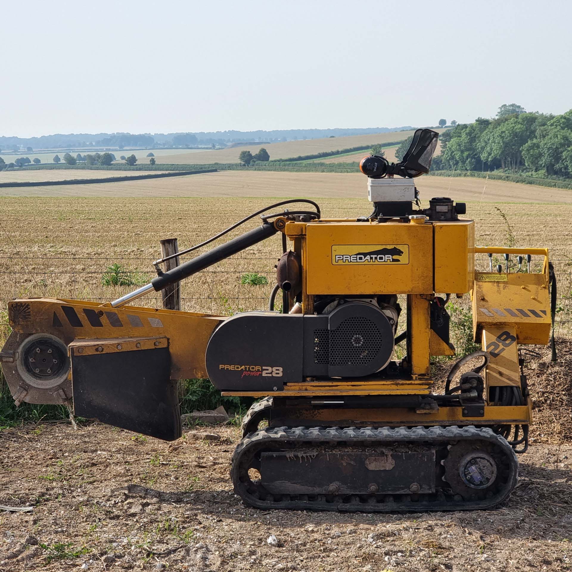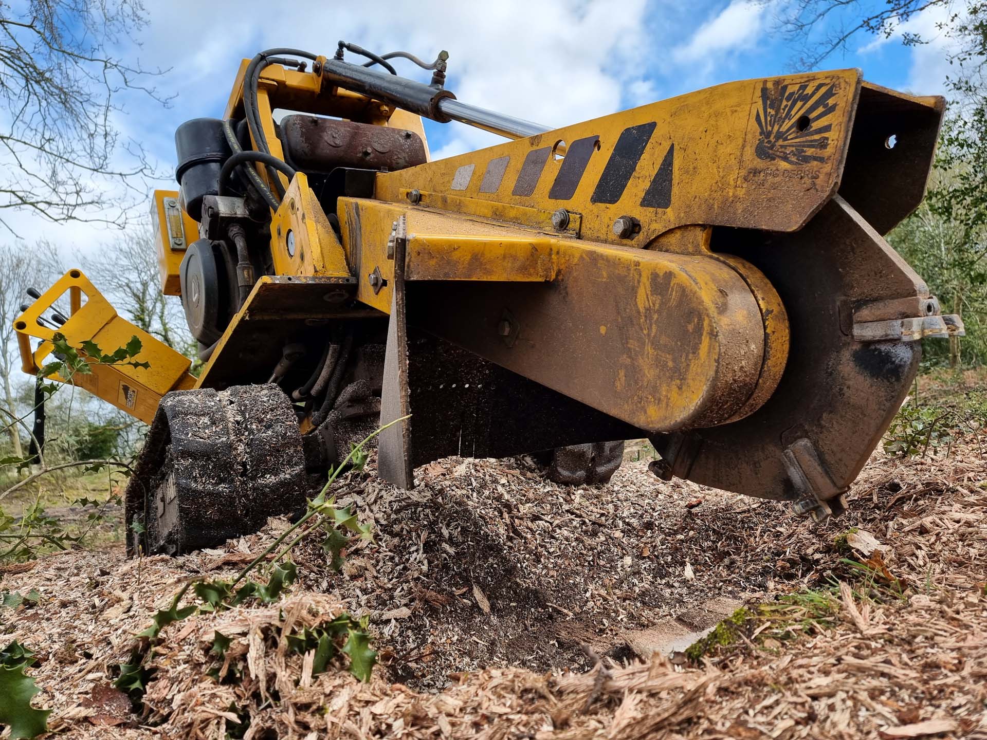 Hampshire Stump Grinding with a large tree stump and a field with blue sky.