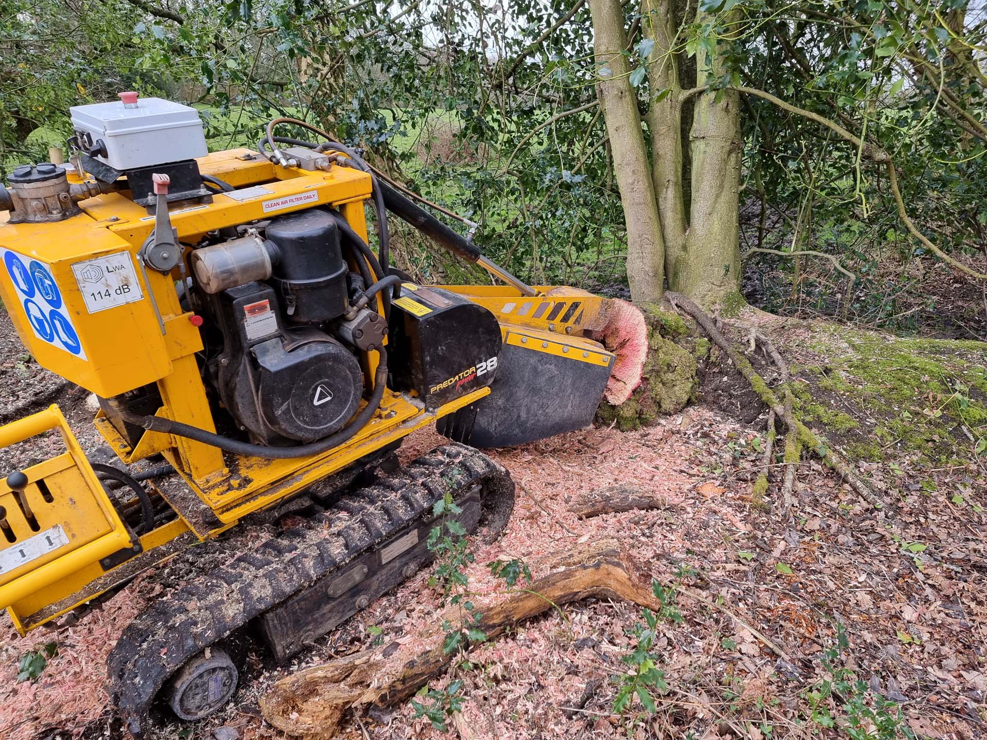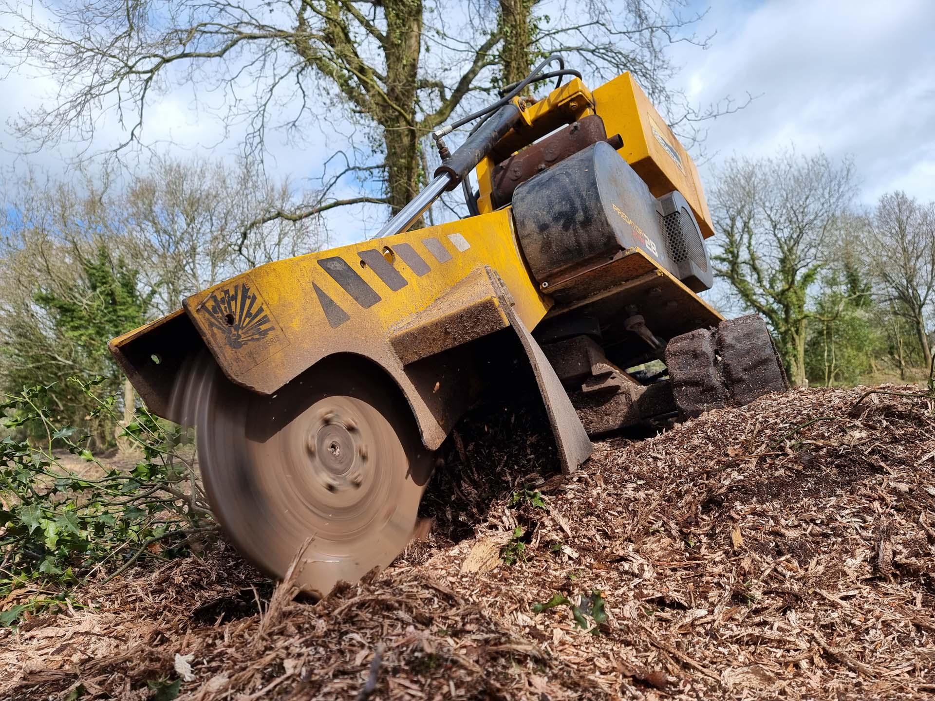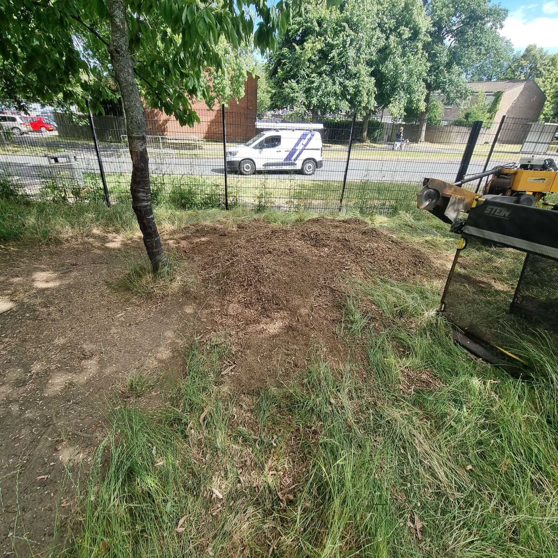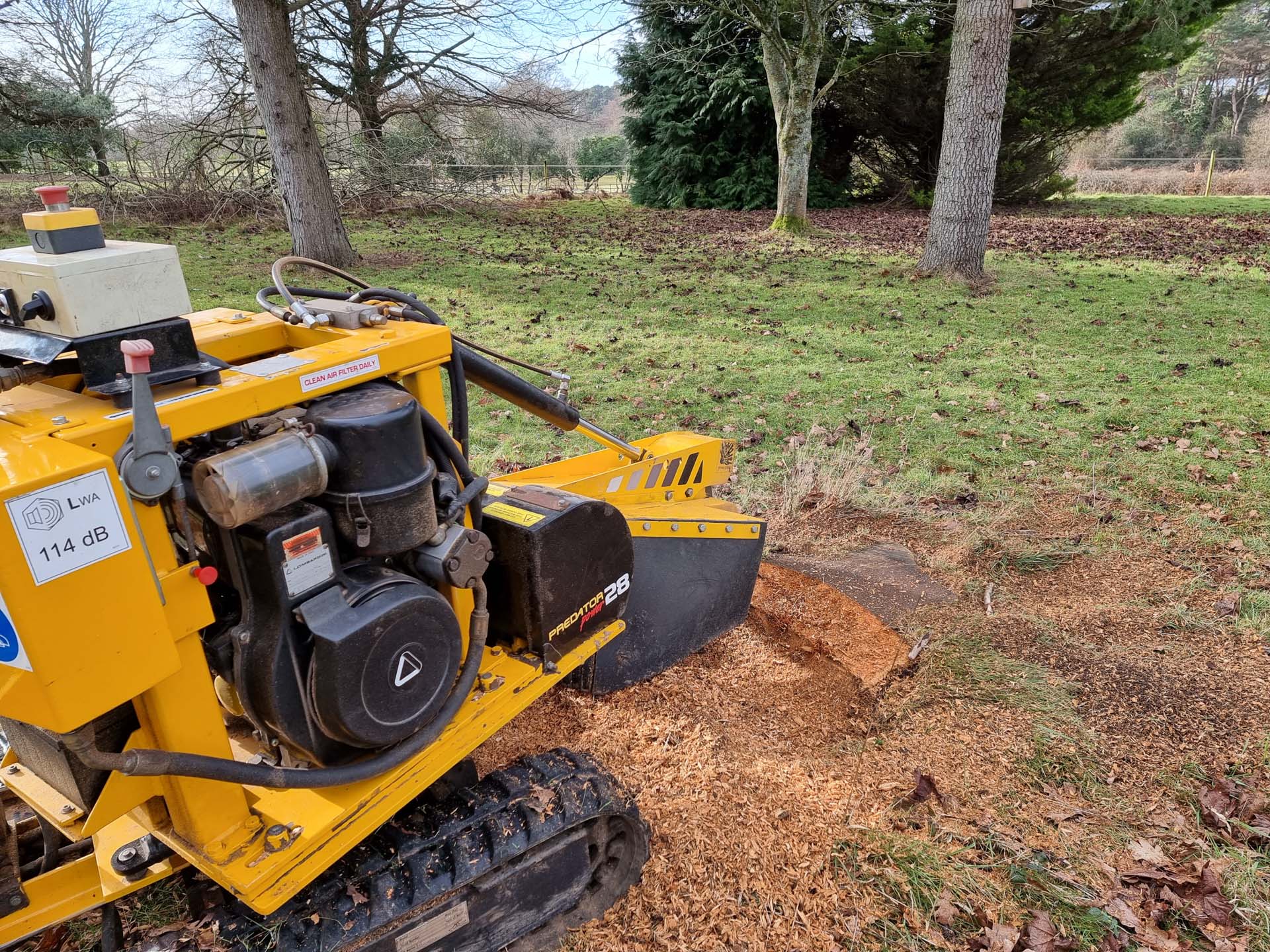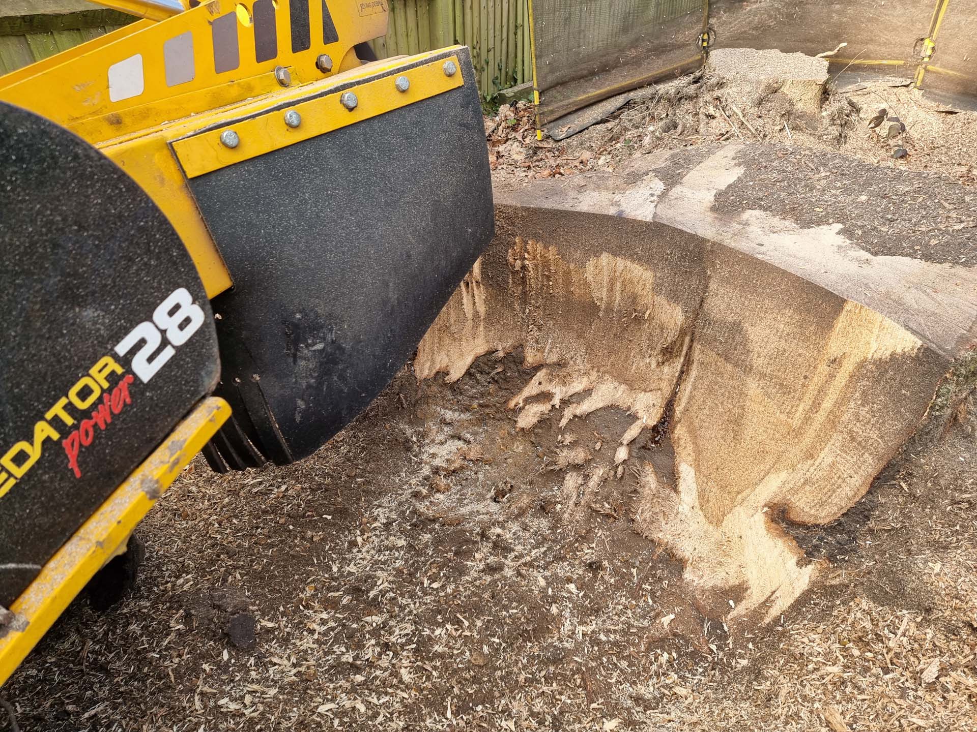Hampshire Stump Grinding with a large tree stump and a field with blue sky.