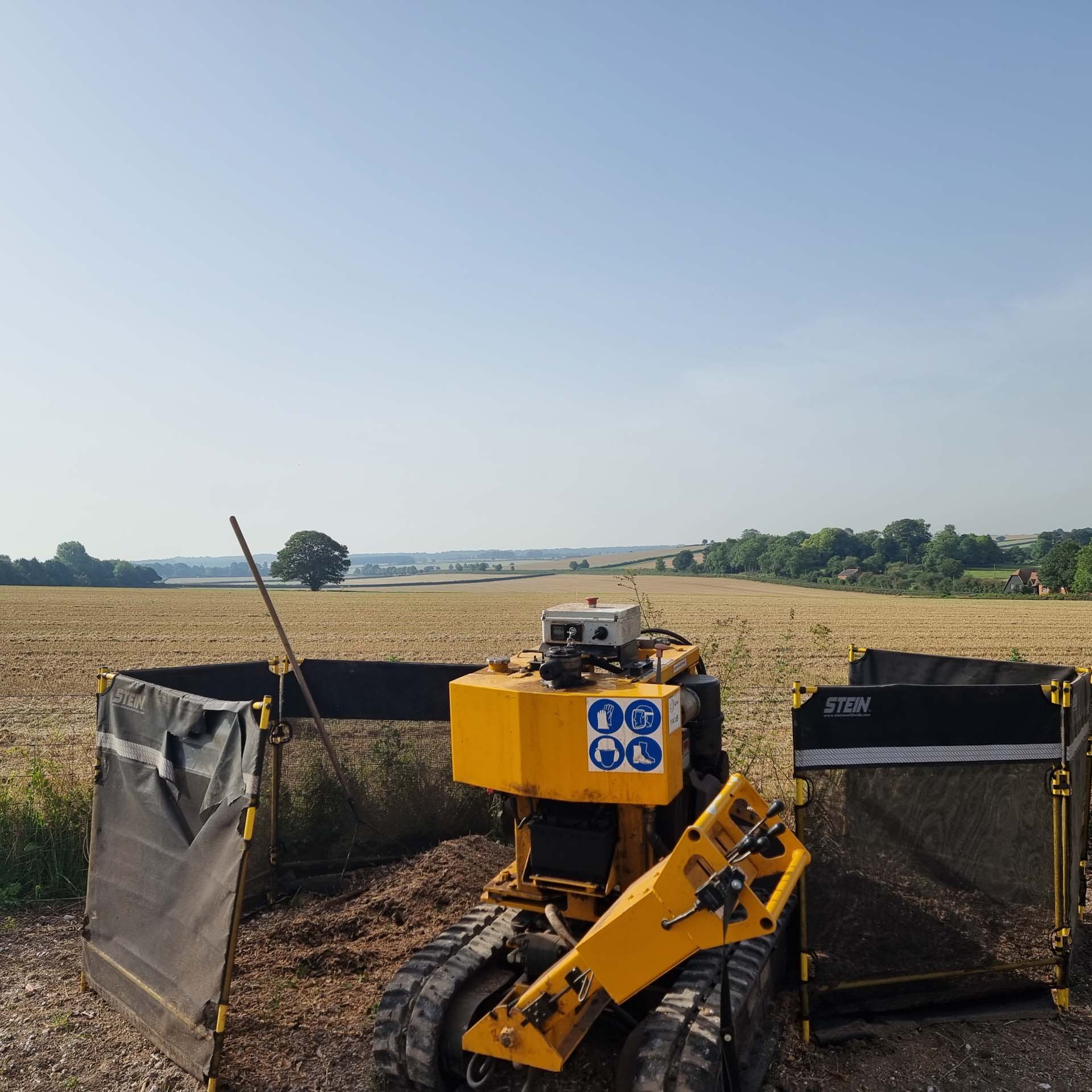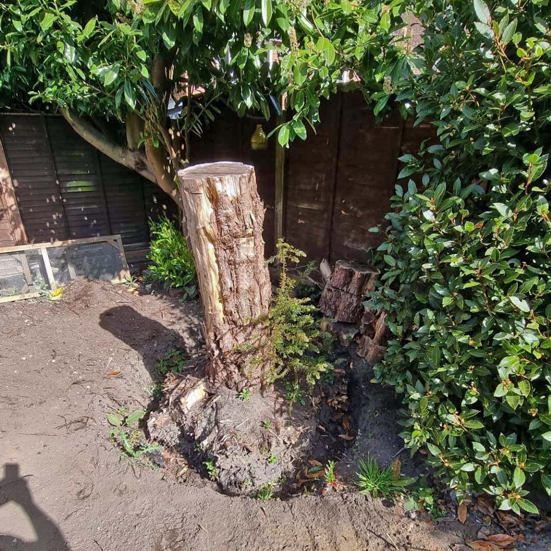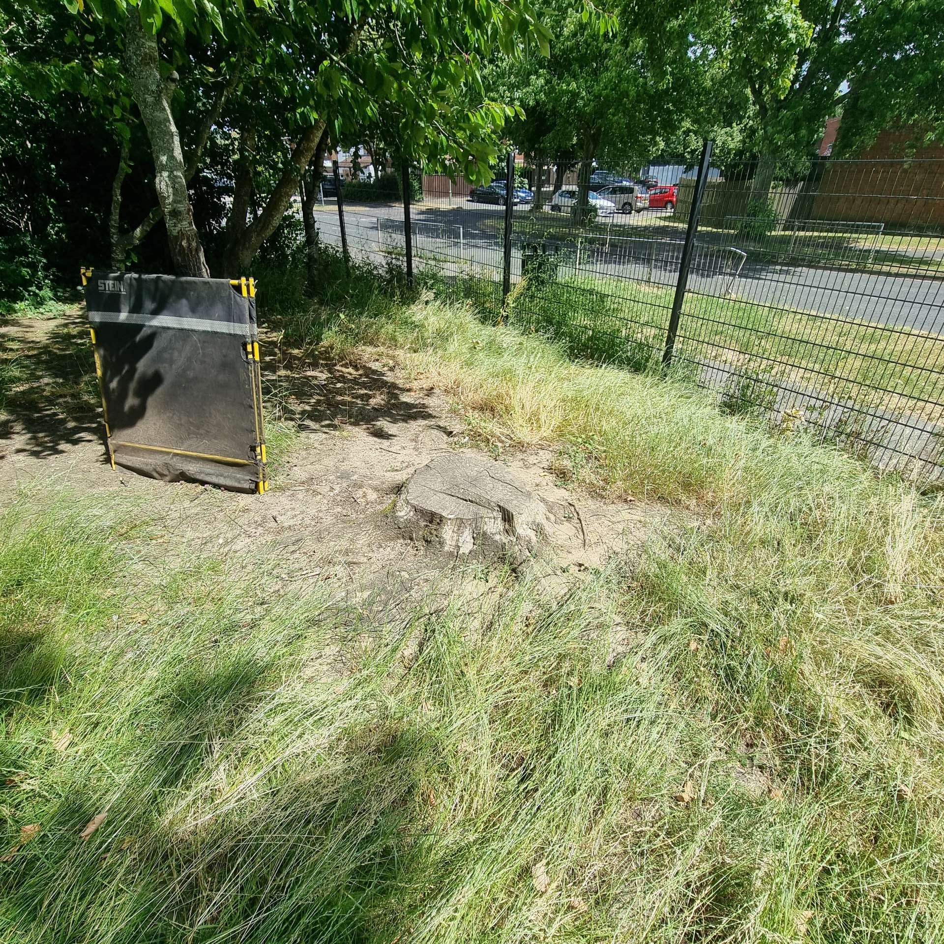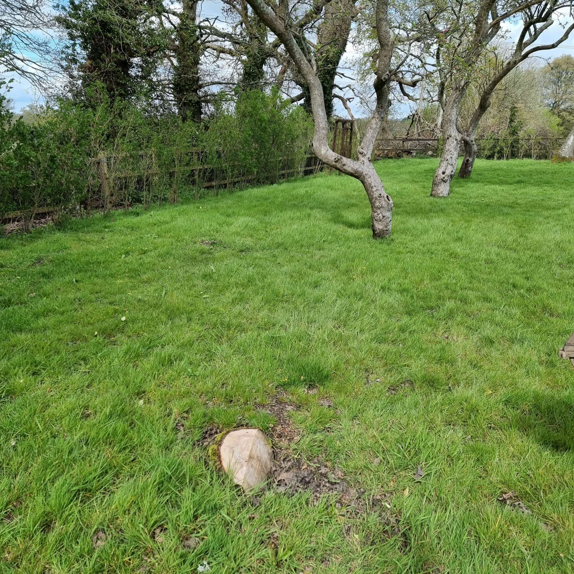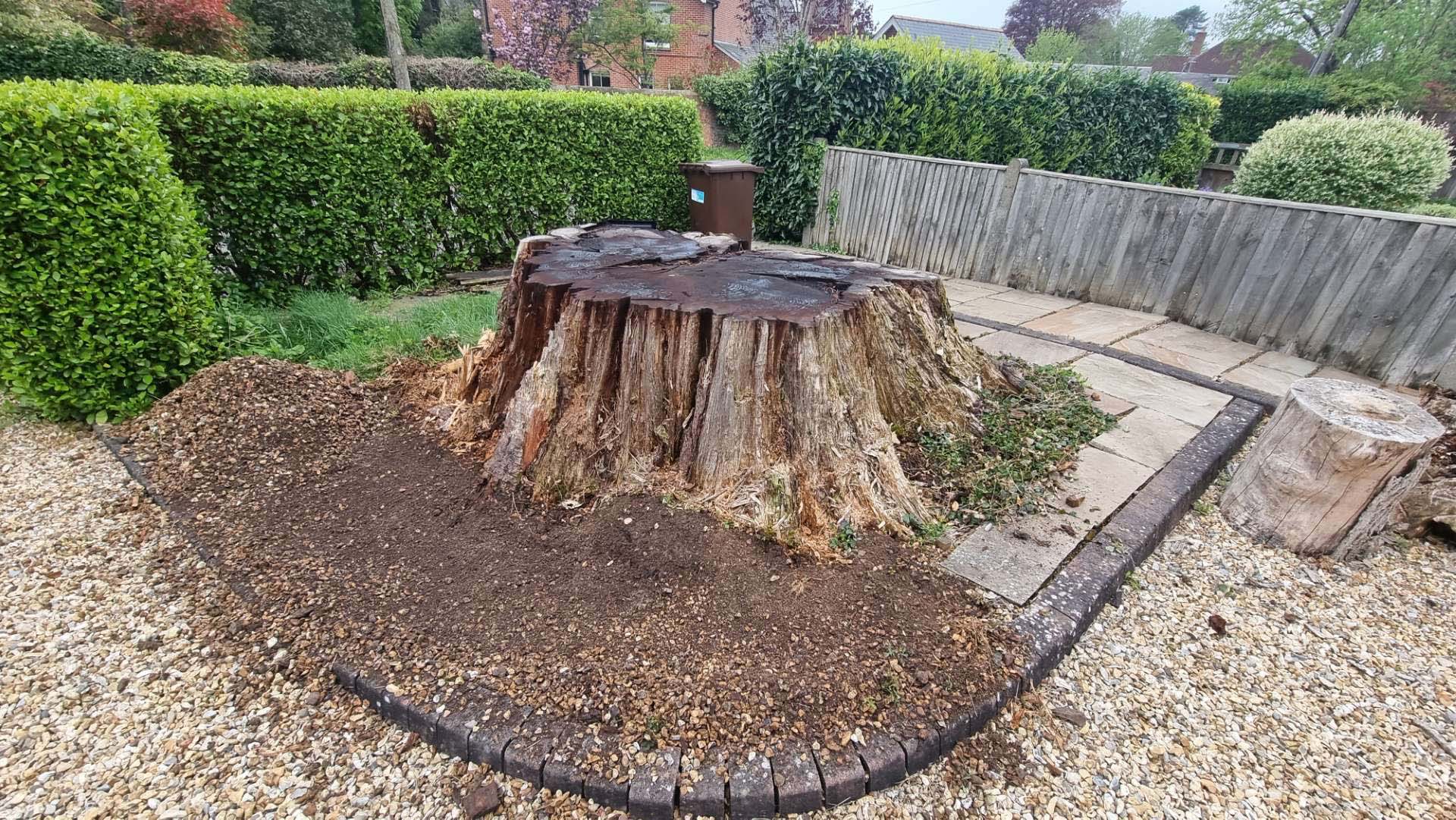 Hampshire Stump Grinding with a large tree stump and a field with blue sky.